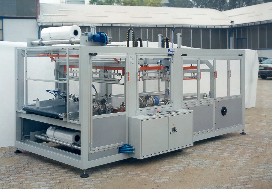 macchine per imballaggio con film termoretraibile. Linee automatiche per il confezionamento di articoli per lavanderia confezionati in pacchi o singolarmente. Con chiusura totale con saldature sui quattro lati