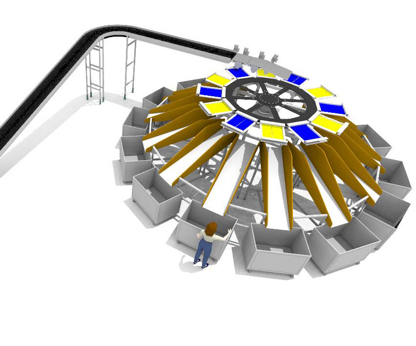 dopo che le pile di capi sono state impacchettate o reggettate, possono essere smistate per la consegna in modo automatico. Varie uscite possono esse predisposte per tipologia oppure per cliente a cui effettuare la consegna. Soluzioni diverse sono disponibili per adattarsi a diverse disponibilità di spazio